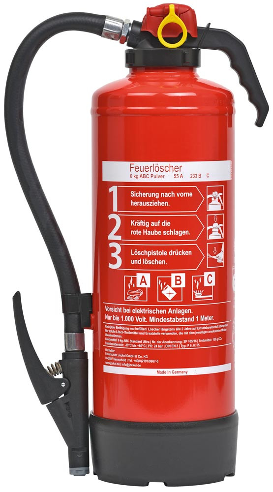 ∙ Universeller ABC-Feuerlöscher als Aufladeversion, ist auch für den Einsatz an elektrischen Anlagen bis 1000 Volt geeignet ∙ Schlagknopfarmatur mit glasfaserverstärktem Polyamidgehäuse und vernickelten Messing-Gewindeeinsätzen ∙ Löschschlauch mit abstellbarer Löschpistole ∙ Inkl. stabilem Fußring und Wandhalter