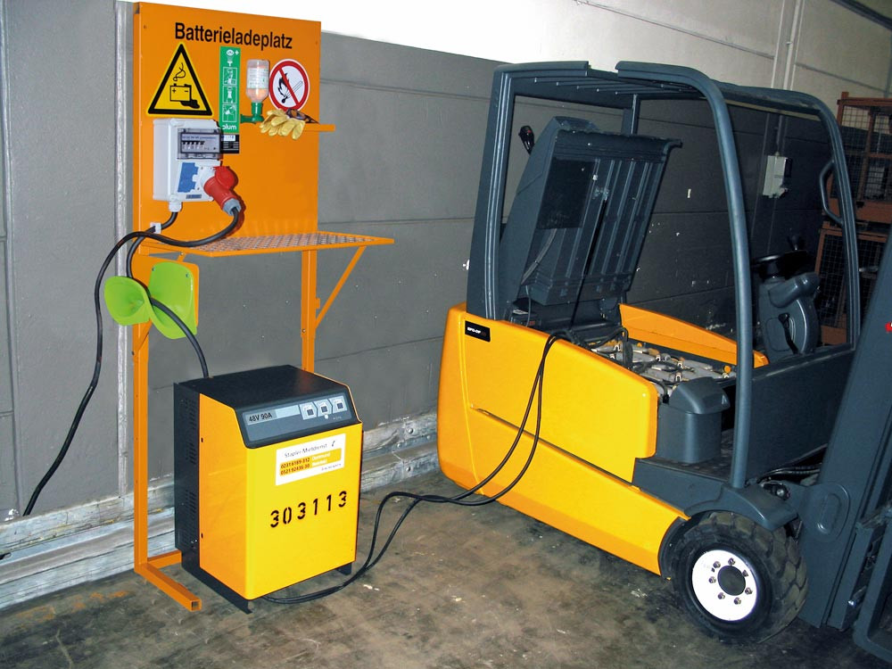 · Laden von Akkumulatoren in Flurförderzeugen gem. den Richtlinien zur Schadenverhütung: BGHW/VdS-Informationsblatt 2259 · Stabile, höhenverstellbare Rahmenkonstruktion, lackiert in RAL 2000 orange · Vorbereitet für die Boden- bzw. Wandbefestigung · Fehlerstrom-Schutzeinrichtung <= 300 mA · 2 Schuko-Steckdosen 230 V 16A · Halterung für Ladekabel · Abklappbarer Tisch für die Aufnahme von Kleinladegeräten · Ablagefach für Handschuhe und Schutzbrille · Augenspülflasche · Inkl. Warnschilder · Abmessung B x T x H 915 x 445 x 1945 mm