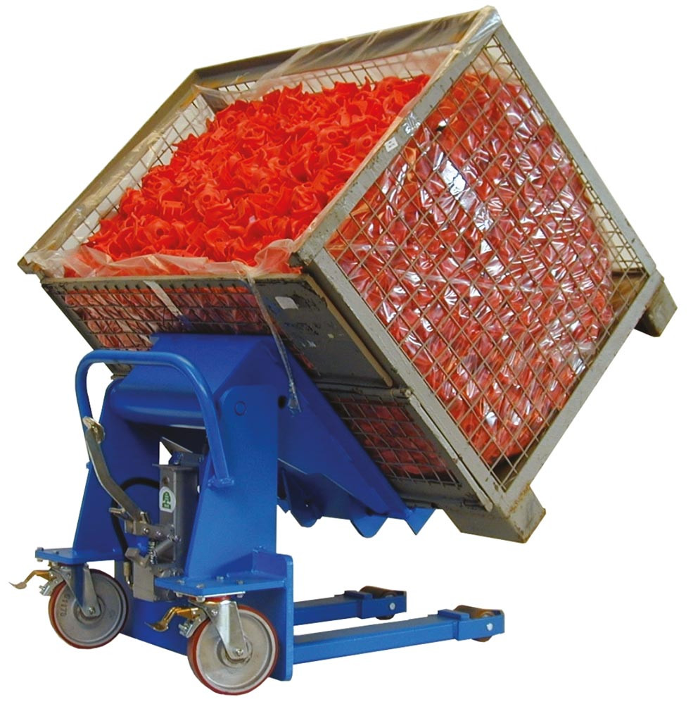 Schwere Behälter, aus denen Material entnommen werden muss, können mit diesem Gerät gekippt werden, um das Material leichter entnehmen zu können.