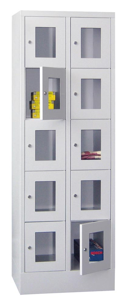 Fächerschränke mit Sichtfenstertüren, 2x5 Fächer, Schloss, BxTxH 600x500x1850 mm, Abt. B 300 mm, RAL 7035