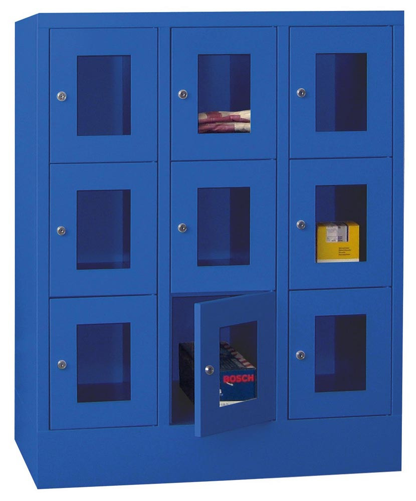 Fächerschränke mit Sichtfenstertüren, 3x3 Fächer, Schloss, BxTxH 900x500x1187 mm, Abt. B 300 mm, RAL 5010