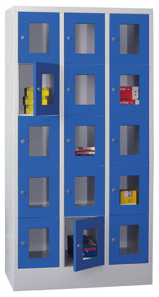 Fächerschränke mit Sichtfenstertüren, 3x5 Fächer, Schloss, BxTxH 900x500x1850 mm, Abt. B 300 mm, RAL 7035/5010