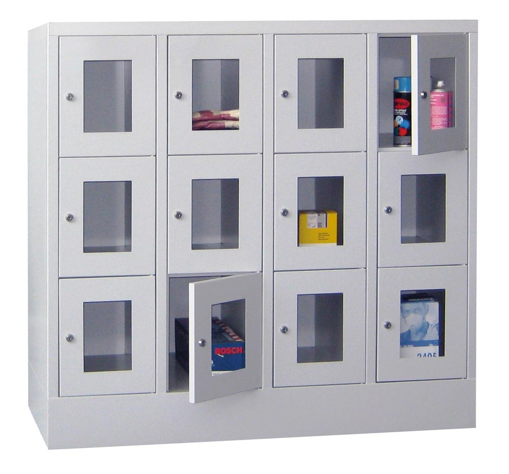 Fächerschränke mit Sichtfenstertüren, 4x3 Fächer, Schloss, BxTxH 1200x500x1187 mm, Abt. B 300 mm, RAL 7035