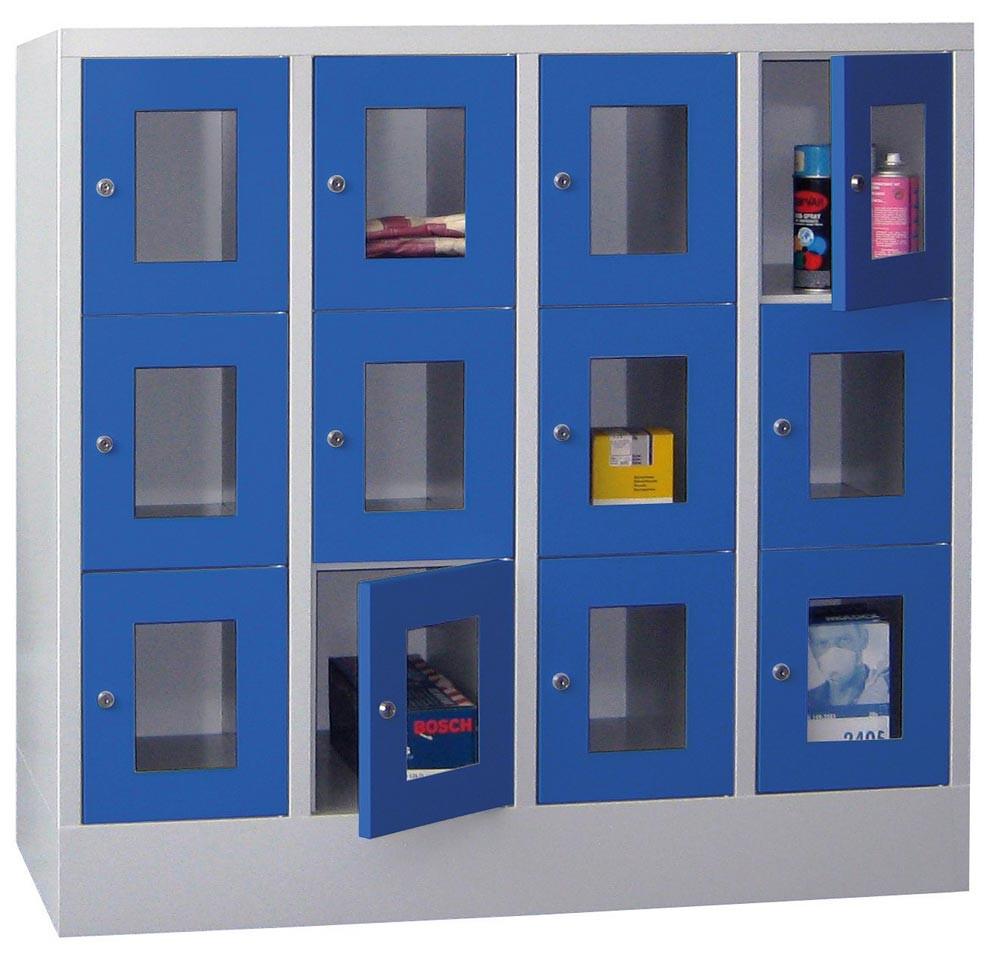 Fächerschränke mit Sichtfenstertüren, 4x3 Fächer, Schloss, BxTxH 1200x500x1187 mm, Abt. B 300 mm, RAL 7035/5010
