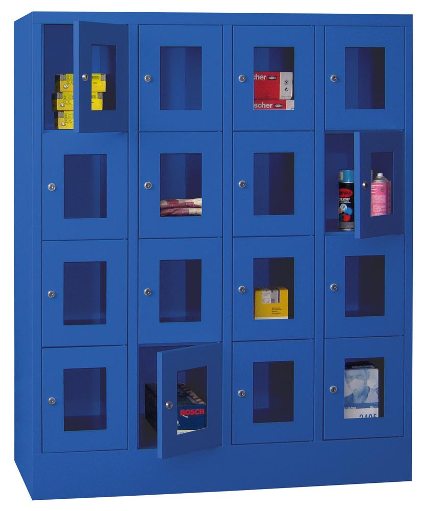 Fächerschränke mit Sichtfenstertüren, 4x4 Fächer, Schloss, BxTxH 1200x500x1518 mm, Abt. B 300 mm, RAL 5010