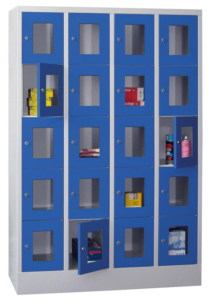 Fächerschränke mit Sichtfenstertüren, 4x5 Fächer, Schloss, BxTxH 1200x500x1850 mm, Abt. B 300 mm, RAL 7035/5010