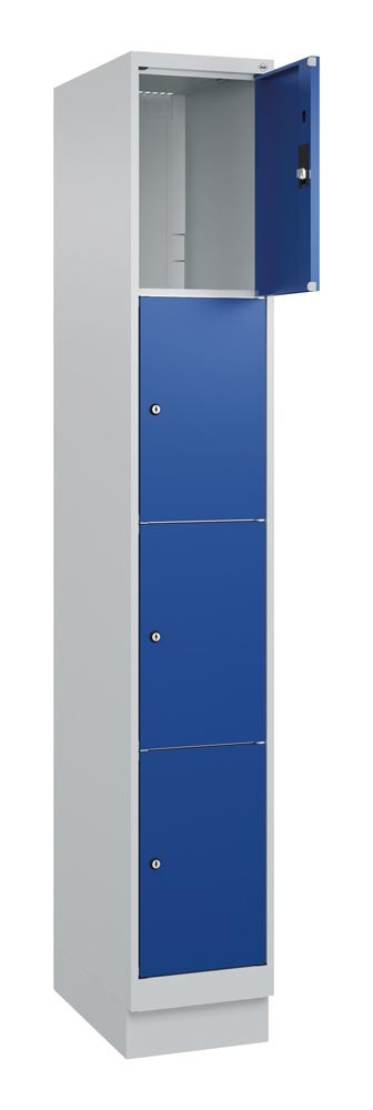Fächerschrank, BxTxH 300x500x1950 mm, 1x4 Fächer, Abt.B 300 mm, Sockel, Schloss, glatte Türen, RAL 7035/5010 EP560083