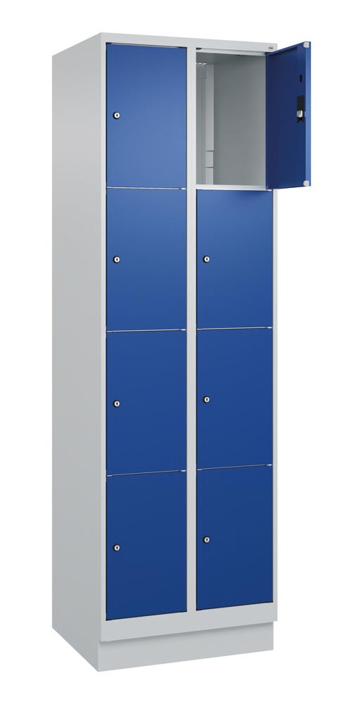 Fächerschrank, BxTxH 600x500x1950 mm, 2x4 Fächer, Abt.B 300 mm, Sockel, Schloss, glatte Türen, RAL 7035/5010