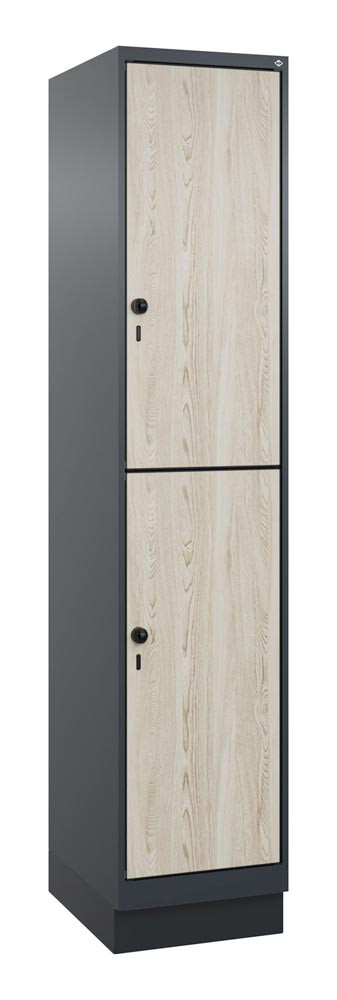 Fächerschrank, doppelstöckig, Sockel, 1x2 Fächer, Abt.B 300 mm, BxTxH 300x500x1950 mm, HPL-Dekorfront, RAL 7016/Dekor Sen Esche EP561942
