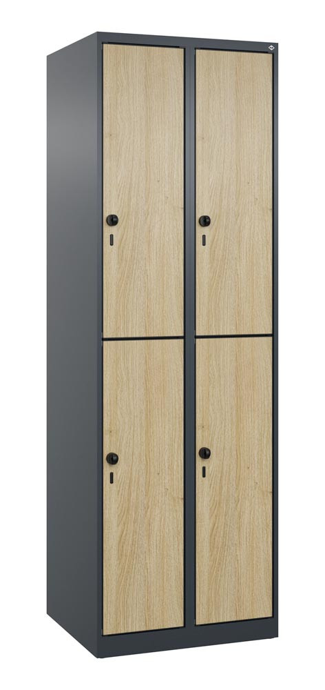 Fächerschrank, doppelstöckig, bodenstehend, 2x2 Fächer, Abt.B 300 mm, BxTxH 600x500x1850 mm, HPL-Dekorfront, RAL 7016/Dekor Eiche Sereno