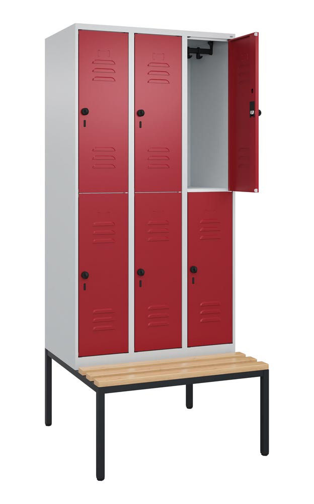 Fächerschrank, untergeb. Sitzbank, BxTxH 900x500x2120 mm, 3x2 Fächer, Abt.B 300 mm, doppelstöckig, Bucheleisten, Drehriegel, Farbwahl