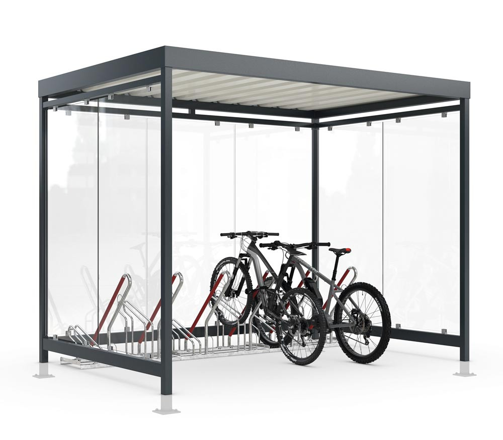 ∙ Feuerverzinkte Flachdach-Stahlkonstruktion inkl. komfortablem Anlehnsystem ∙ Schützt hochwertige Fahrräder vor Beschädigung und Diebstahl ∙ Einscheibensicherheitsglas mit Glashaltern ∙ Entwässerung erfolgt über bodenseitige Wasserspeier ∙ Für sehr hohe Wind- und Schneelasten geeignet ∙ Für Reifenbreiten bis 64 mm ∙ Inkl. Fahrradständer ∙ Mit Überpflasterung