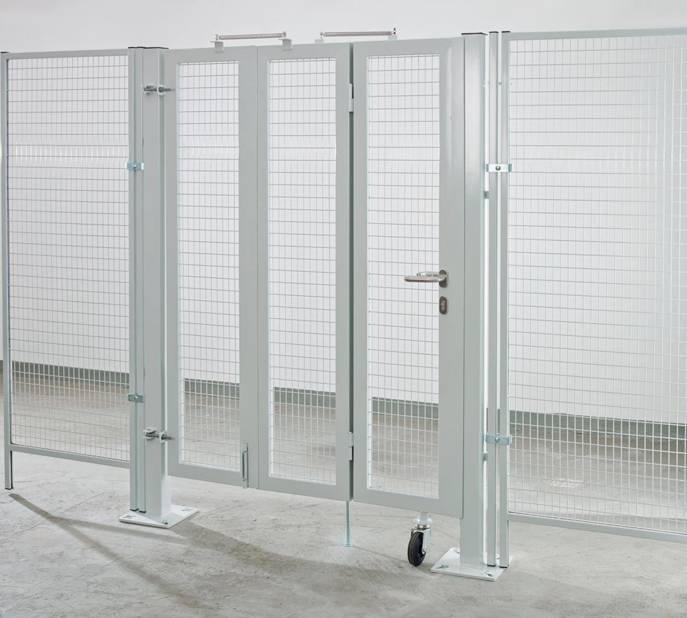 · Optimaler Schutz in Bereichen mit wenig Platz · Flachgittermaschung 40 x 40 mm in Rahmenprofil 60/40 mm eingefasst · Direkt in das Trennwandsystem integrierbar · Leichtes Öffnen und Schließen durch drehbare Räder · Komplett ausgestattet mit Torrahmenschloss und Drückergarnitur · Inkl. stabiler QR-Pfosten und verstellbarer Torbänder · Farbe RAL 7037 staubgrau
