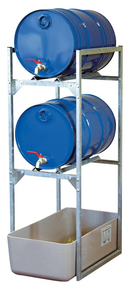 Fassregal für 2 Stück 60-l-Fässer, aus Stahl, verzinkt, mit GFK-Auffangwanne 65 l, BxTxH 450x820x1310 mm