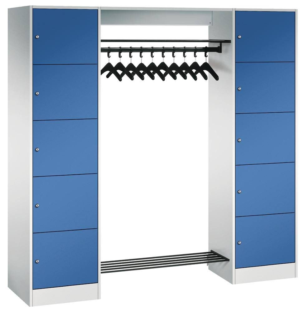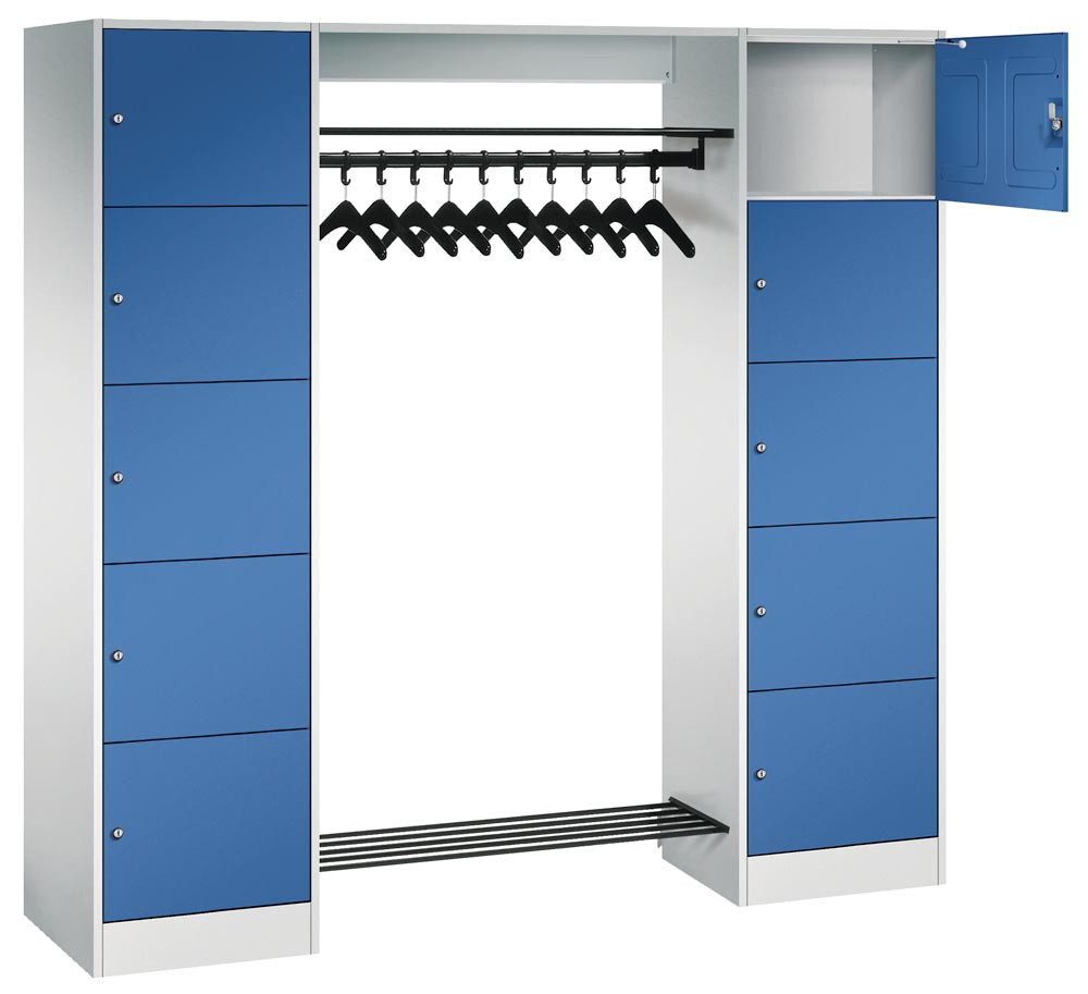 Schließfachschränke mit 5 Fächern übereinander bieten in Kombination mit funktionalen Garderobeneinheiten für 5, 10, 15 oder 20 Personen ausreichend Platz für Kleidung und persönliche Dinge.
