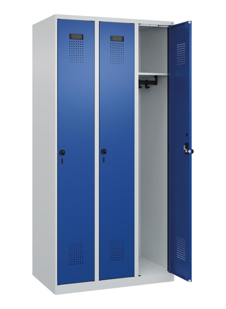 ∙ Stabile Stahlkonstruktion mit hochwertiger Einbrennbeschichtung ∙ Verstärkte Türen mit Anschlagsdämpfer für geräuscharmes Schließen ∙ Designlochbilder für optimale Belüftung ∙ Stabile Garderobenstange mit 3 verdrehsicherem Doppel-Schiebehaken ∙ Glatter Abteilboden für einfaches Auskehren ∙ Fußteil und Schrankboden serienmäßig verzinkt für erhöhten Korrisionschutz ∙ Innovative Kant- und Biege-Geometrien, sowie Materialdopplungen ∙ Fest verschweißter Ablageboden pro Abteil ∙ Optimierte Lüftungsöffnungen im Abteil · Pro Abteil 1 Ablageboden · Korpus T 500 mm · Wahlweise 2-, 3- oder 4 Abteile