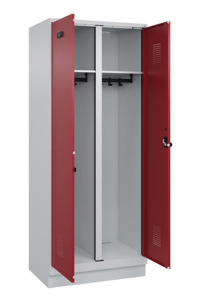 Garderobenschrank, paarw. zuein. schlagende Türen, BxTxH 800x500x1950 mm, 2 Abteile, 1 Nutzer, Abt.B 400 mm, Sockel, Drehriegel, Farbwahl