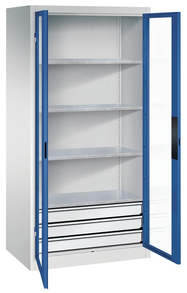 Großraum-Werkzeugschrank mit Sichfensterflügeltüren, 3 Schubladen unten, 4 Verstellböden, BxTxH 930x500x1950 mm, RAL 7035/5010 EP531427
