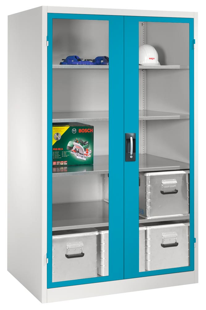 Großraum-Werkzeugschrank mit Sichtfenstertüren, 4 Verstellböden, BxTxH 1200x800x1950 mm, RAL 7035/5010