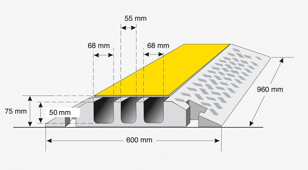 · Zum mühelosen Überfahren und zum Schutz von Kabeln, Schläuchen und Rohren · Innovatives Stecksystem aus Formstücken · Hoch belastbare, spezielle Hartgummi-Mischung · Deckel aus hochwertigem Kunststoff · 3 Kanäle, davon 2 Kanäle 68 x 50 mm und 1 Kanal 55 x 50 mm ∙ Getestet bis 12 t Achslast