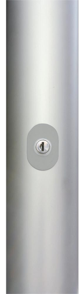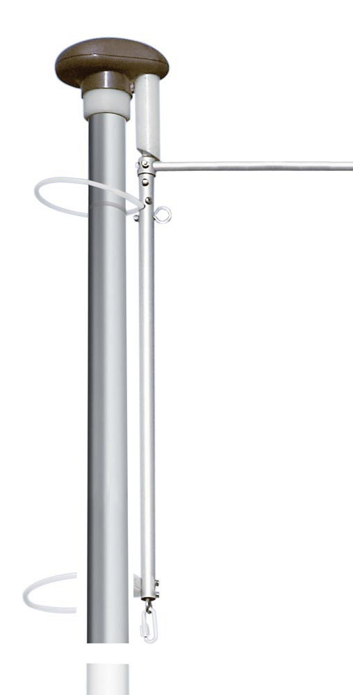 · Mast dreht sich mit dem Wind · Innenliegende Hissseilführung in aufgesetzter Aluminiumschiene · serienmäßig abschließbar · Hissbarer Drehausleger · Vertikale Fahnentuchführung durch Gleiter in Aufsetzschiene · Hissvorrichtung mit Seilklemme · Mastbeschläge aus Aluminium und Edelstahl · Mastkopf aus Edelstahl mit Umlenkeinheit · Statischer Nachweis nach DIN 1055 ∙ Inklusive Bodenhalterung mit Zentrierkeil