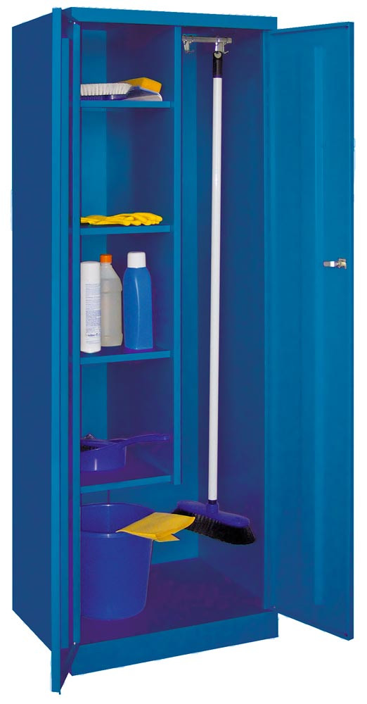 Putzmittelschr. mit Sockel, mittig verk. Trennw., li. 4, Böden, Stange mit 3 Haken, BxTxH 600x500x1800 mm, RAL 5010 EP528607