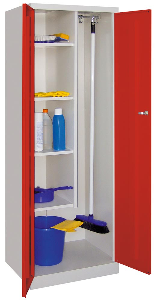 Putzmittelschr. mit Sockel, mittig verk. Trennw., li. 4, Böden, Stange mit 3 Haken, BxTxH 600x500x1800 mm, RAL 5010 EP528607