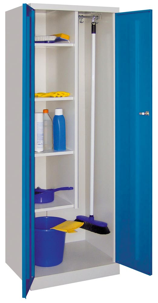 Putzmittelschr. mit Sockel, mittig verk. Trennw., li. 4, Böden, Stange mit 3 Haken, BxTxH 600x500x1800 mm, RAL 5015 EP528674