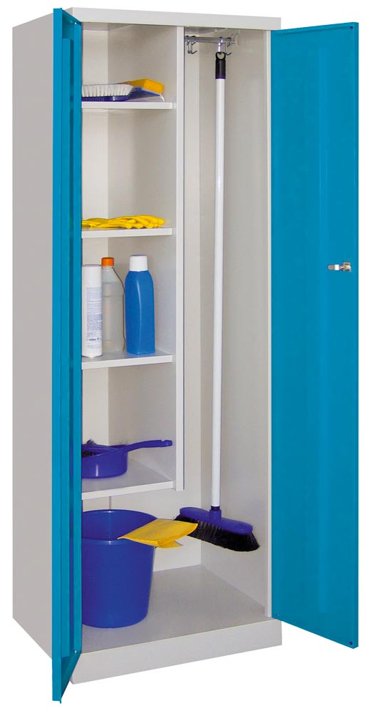 Putzmittelschr. mit Sockel, mittig verk. Trennw., li. 4, Böden, Stange mit 3 Haken, BxTxH 600x500x1800 mm, RAL 5010 EP528607