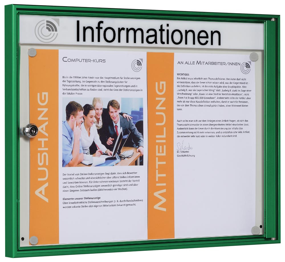 Schaukasten, BxTxH 500x27x380 mm, 2xDIN A4, Aluprofile grün, ESG-Glas, Rückwand weiß, magneth.