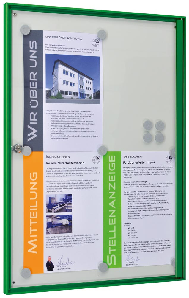 Schaukasten, BxTxH 500x27x700 mm, 4xDIN A4, Aluprofile grün, ESG-Glas, Rückwand weiß, magneth.