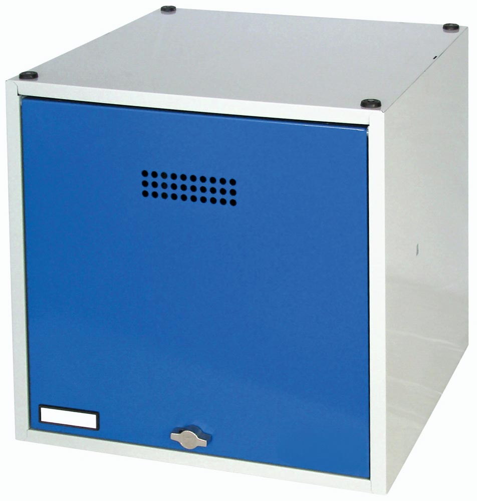 Schließfachwürfel, BxTxH 500x500x500 mm, Tür glatt, Lochrosetten und Etikettenrahmen, Fachboden, Drehriegel, RAL 7035/5010 EP520460