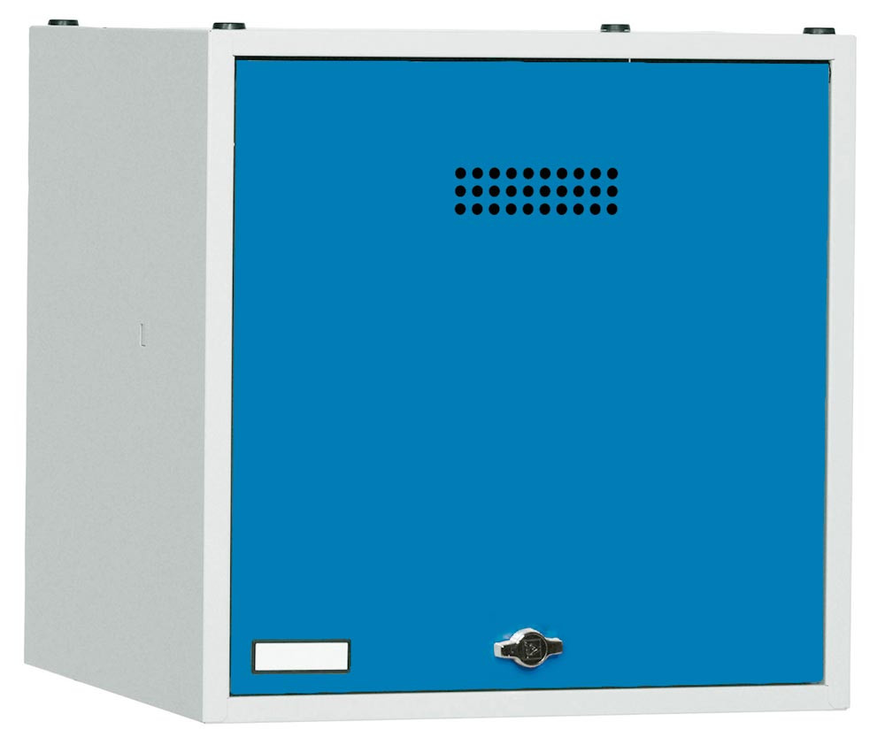 Schließfachwürfel, BxTxH 500x500x500 mm, Tür glatt, Lochrosetten und Etikettenrahmen, Fachboden, Drehriegel, RAL 7035/5010 EP520460