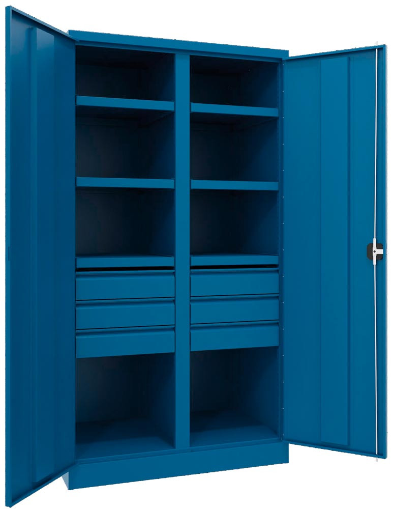Schwerlastschrank, Vollblechtüren, m. Trennwand, 6 Böden, 200 kg Traglast, 4 Schubl. 175 mm, BxTxH 1040x630x1950 mm, RAL 5010 EP562136