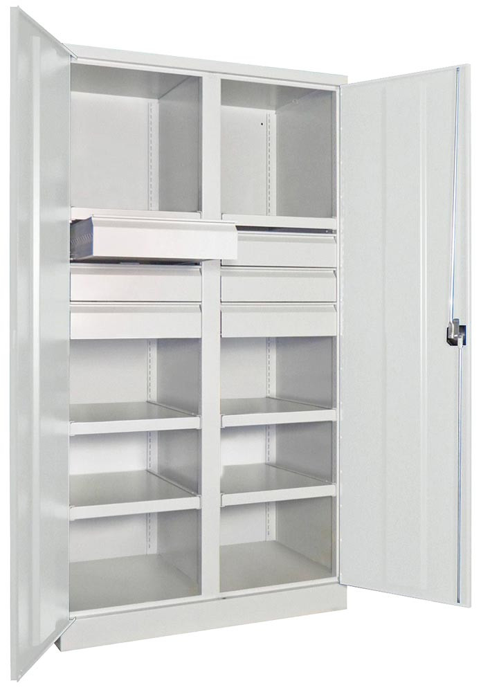 ∙ Besonders stabile, verwindungssteife Stahlblechkonstruktion ∙ Oberfläche pulverbeschichtet ∙ Schränke mit gemeinsam verschließbaren Flügeltüren mit Verstärkungstaschen ∙ Die Türen sind über einen dreiriegeligen Drehgriff mit integriertem Zylinderschloss inkl. 2 Schlüsseln verschließbar ∙ Türöffnung 180 ° ∙ Belastbarkeit je Boden 200 kg, je Schublade 60 kg bei gleichmäßig verteilter Last ∙ Gehäuse-Belastbarkeit 1300 kg ∙ Einrichtungselemente im Raster von