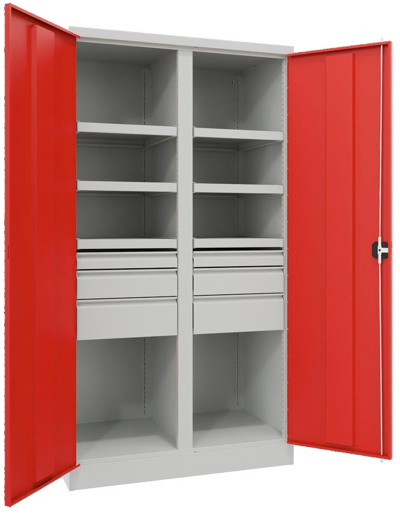 Schwerlastschrank, Vollblechtüren, m. Trennwand, 6 Böden, 200 kg Traglast, 4 Schubl. 175 mm, BxTxH 1040x630x1950 mm, RAL 5010 EP562136