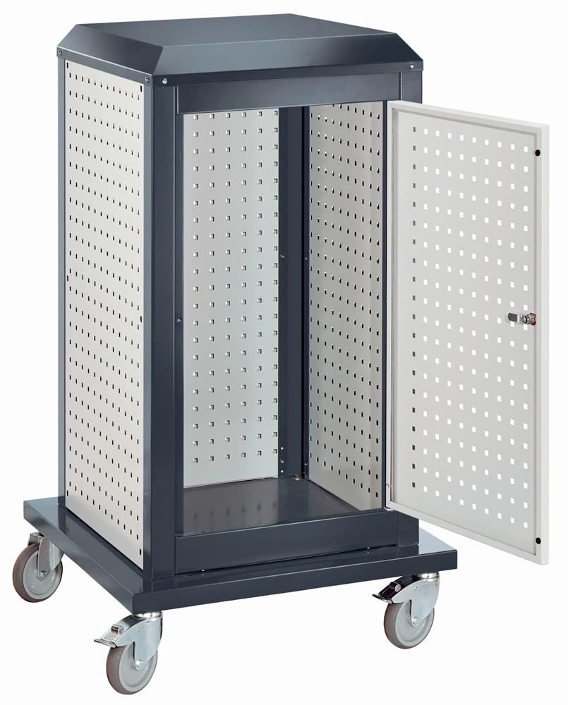 Tool-Tower klein, BxTxH 700x700x1260 mm, mobil, 3 Lochplatten, 1 Tür, RAL 7016/7035