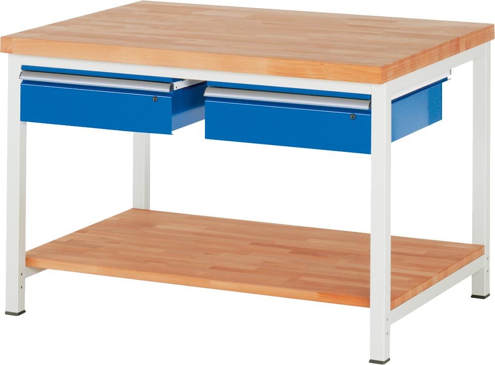 Werkbank, BxTxH 1250x900x840-1040 mm, 2 Schubladen 150 mm, Ablageboden, Platte Buche 40 mm, RAL 7035/5010 EP562662