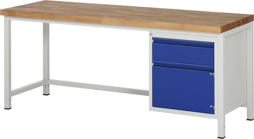 Werkbank, BxTxH 2000x700x840 mm, Platte Buche 40 mm, 1 Schublade 150 mm, 1 Tür 360 mm, RAL 7035/5010 EP531039