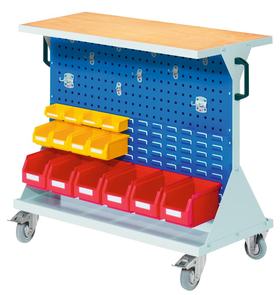 Werkstattwagen, 2 Loch-/2 Schlitzpl., 1 Hakensort. 10-tlg., 14 Kästen, BxTxH 1000x500x930 mm, 1 Auflageboden Stahl m. Multiplexplatte, RAL 7035/5010