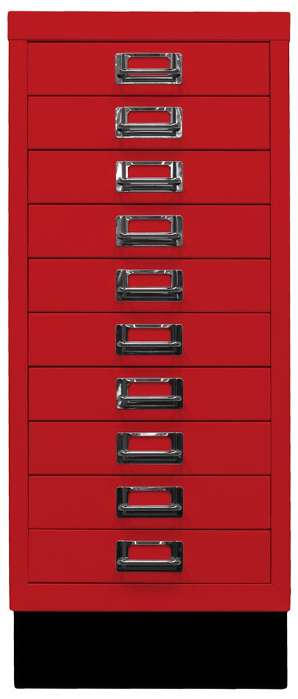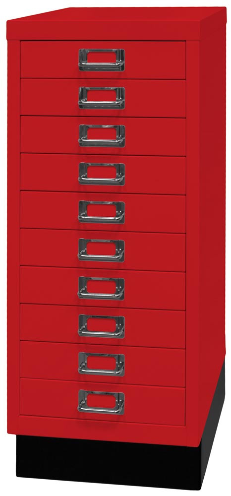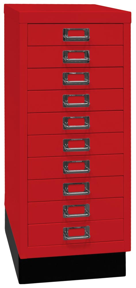 Büro-Schubladenschrank, BxTxH 279x380x670 mm, 10 Schubladen 51 mm, DIN A4, Sockel 80 mm hoch, kardinalrot