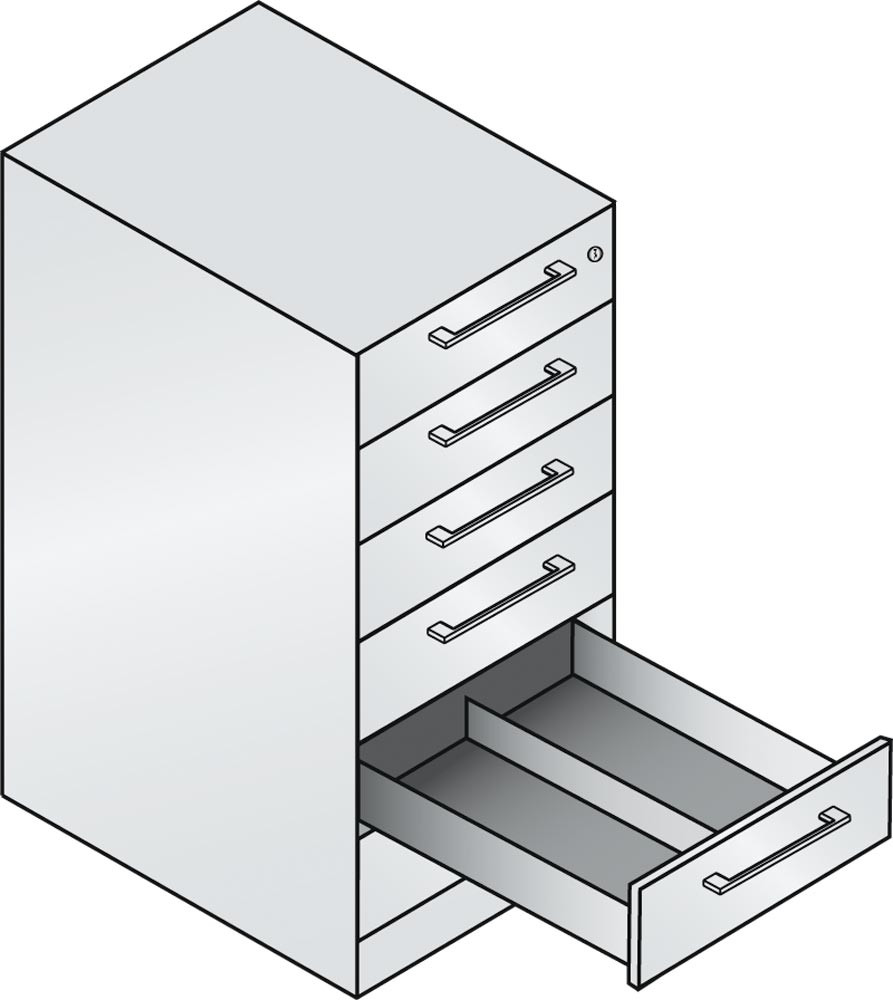 ∙ Robuste und langlebige Stahlkonstruktion mit hochwertiger Einbrennlackierung ∙ Schubladen auf 100 % ausziehbaren Kugelrollen-Teleskopführungen ∙ Schubladenfronten mit matt-verchromtem Bügelgriff ∙ Zentralverschluss mit Auszugsperre ∙ Austauschbarer Wechselkern, inkl. 2 Schlüsseln ∙ Inkl. selbstklebenden Kunststoff-Etikettenrahmen