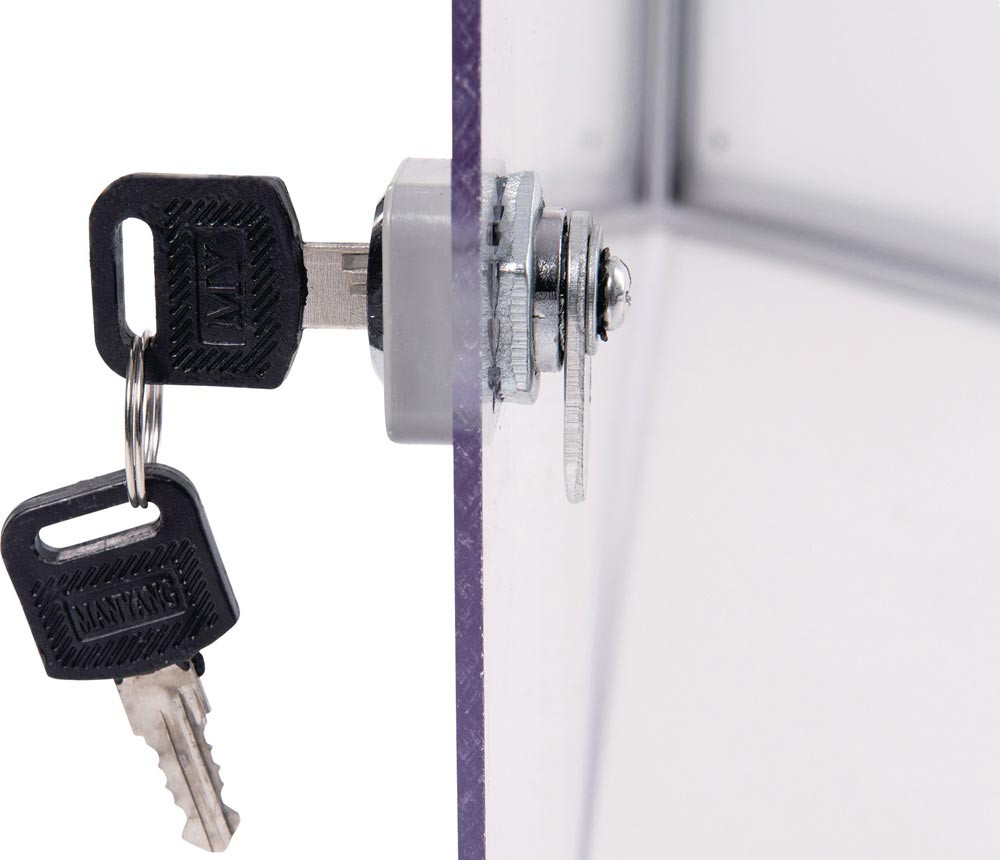 · Einseitiger Schaukasten zur Wandmontage · Bautiefe 31 mm · Innentiefe 9 mm · Rahmen aus silbereloxiertem Aluminiumprofil · Abgeschrägte Eckverbindungen aus Kunststoff · Rahmenlose Flügeltür aus Kunststoffglas mit integriertem Schloss, ab Format 9 x A4 mit 2 Schlössern · Abschließbar, inkl. 2 Schlüsseln · Rückwand aus grau beschichtetem Stahlblech · Magnethaftend · Beschrift- und trocken abwischbar