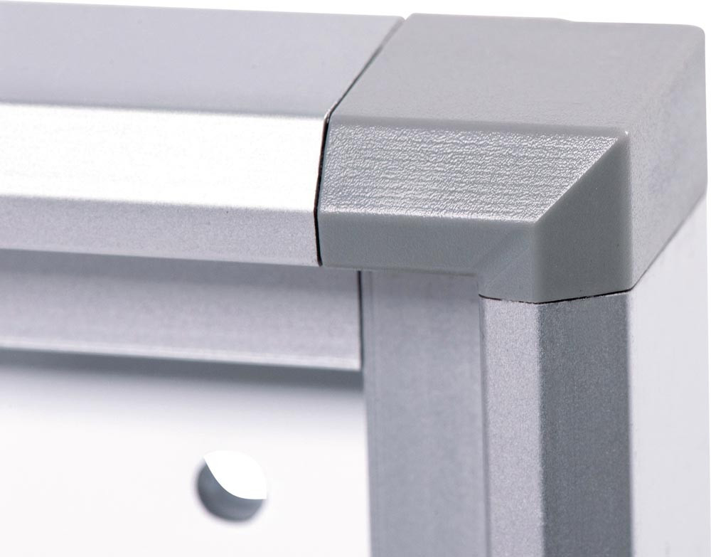 ideal für professionelles Informieren im Innenbereich · Bautiefe 31 mm -Innentiefe 9 mm · Rahmen aus silbereloxiertem Aluminiumprofil · rahmenlose Flügeltür aus Kunststoffglas, mit integriertem Schloss · abgeschrägte Eckverbindungen aus Kunststoff · Rückwand aus beschichtetem Stahlblech, magnethaftend, beschriftbar und trocken abwischbar · einfache Montage