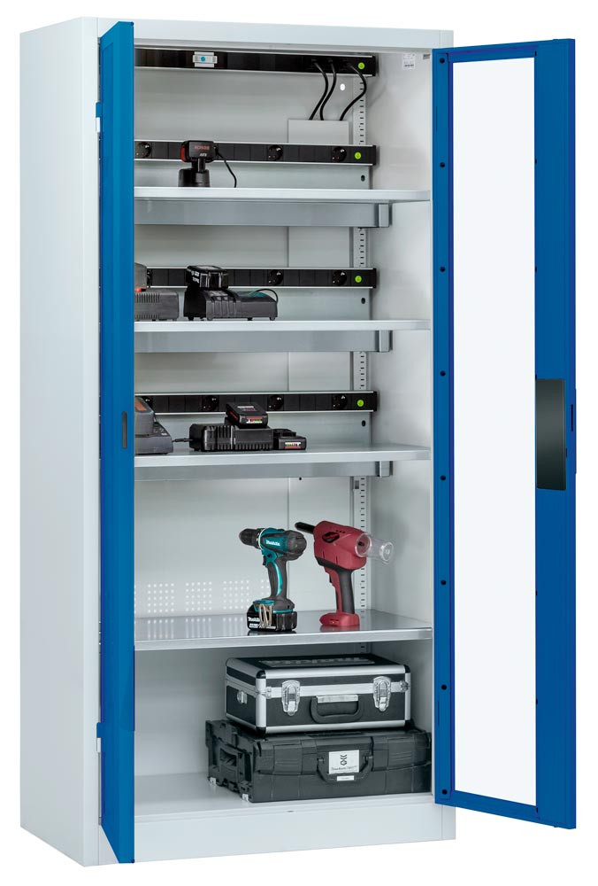 Akkulade-Schrank, Sichtfenster-Türen, BxTxH 930x500x1950 mm, 3 Böden mit je 5-fach Steckdosenleiste,1 Einlegeboden, RAL 7035/5010 EP554773