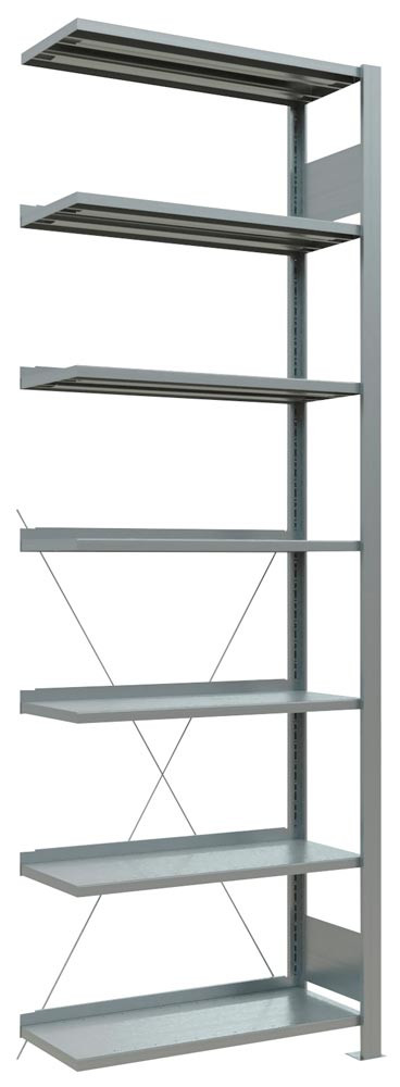 · Ständerrahmen mit Tiefenriegeln, pulverbeschichtet in RAL 7035 lichtgrau · Rahmenfronten ungelocht zur attraktiven Optik · Aussteifung durch Kreuzstrebe · Stahlfachböden mit 25 mm hoher Kante, höhenverstellbar im 25-mm-Raster, RAL 7035 lichtgrau · Mit Anschlagleiste (der Deckboden hat keine Anschlagleiste) ∙ Zur einseitigen Regalbestückung