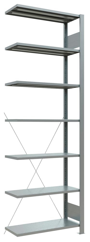 · Ständerrahmen mit Tiefenriegeln, pulverbeschichtet in RAL 7035 lichtgrau · Rahmenfronten ungelocht zur attraktiven Optik · Aussteifung durch Kreuzstrebe · Stahlfachböden mit 25 mm hoher Kante, höhenverstellbar im 25-mm-Raster, RAL 7035 lichtgrau · Ohne Anschlagleiste ∙ Zur einseitigen Regalbestückung