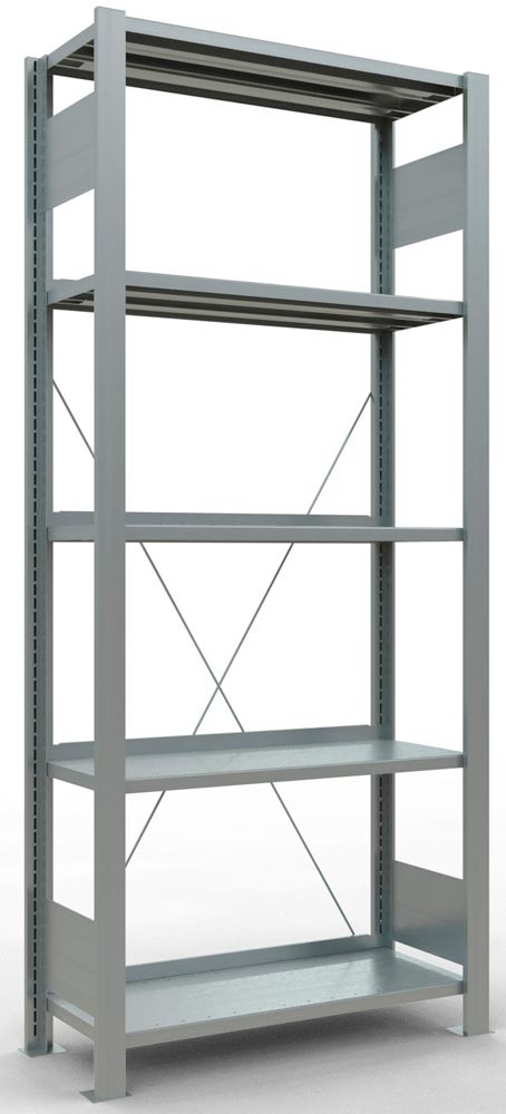 · Ständerrahmen mit Tiefenriegeln, pulverbeschichtet in RAL 7035 lichtgrau · Rahmenfronten ungelocht zur attraktiven Optik · Aussteifung durch Kreuzstrebe · Stahlfachböden mit 25 mm hoher Kante, höhenverstellbar im 25-mm-Raster, RAL 7035 lichtgrau · Mit Anschlagleiste (der Deckboden hat keine Anschlagleiste) ∙ Zur einseitigen Regalbestückung