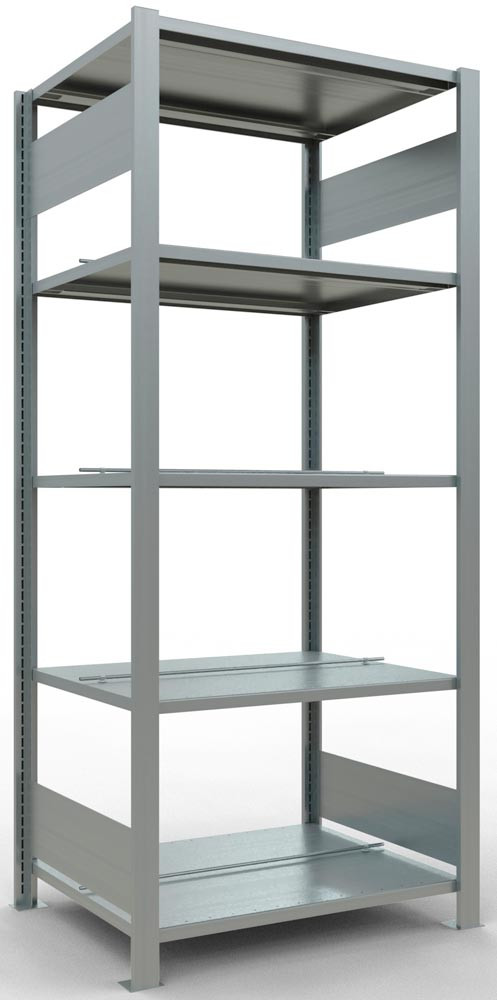 · Ständerrahmen mit Tiefenriegeln, pulverbeschichtet in RAL 7035 lichtgrau · Rahmenfronten ungelocht zur attraktiven Optik · Aussteifung durch Längsriegel · Stahlfachböden mit 25 mm hoher Kante, höhenverstellbar im 25-mm-Raster, RAL 7035 lichtgrau · Mit Mittelanschlag (der Deckboden hat keinen Mittelanschlag) ∙ Zur doppelseitigen Regalbestückung