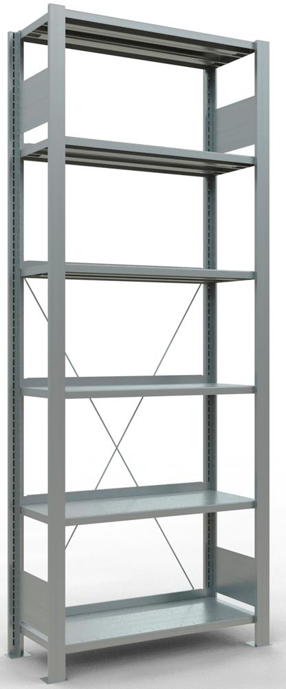 · Ständerrahmen mit Tiefenriegeln, pulverbeschichtet in RAL 7035 lichtgrau · Rahmenfronten ungelocht zur attraktiven Optik · Aussteifung durch Kreuzstrebe · Stahlfachböden mit 25 mm hoher Kante, höhenverstellbar im 25-mm-Raster, RAL 7035 lichtgrau · Mit Anschlagleiste (der Deckboden hat keine Anschlagleiste) ∙ Zur einseitigen Regalbestückung